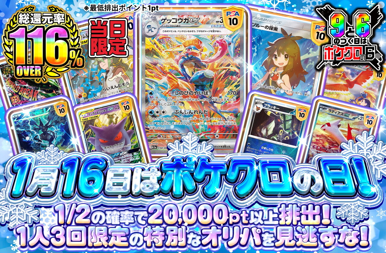 ポケクロの日は9と6が付く日に開催するイベントです。還元率106%以上のオリパが登場し、最大120%超えのオリパも開催されます。